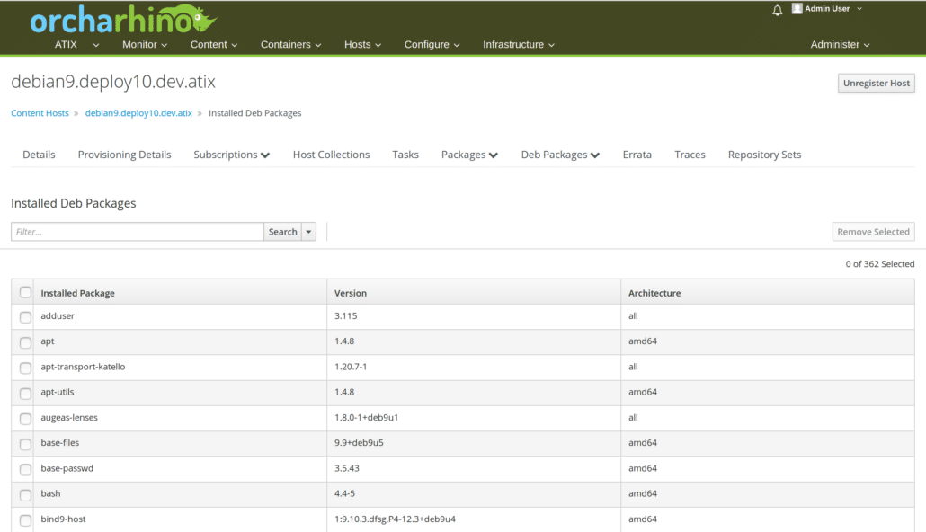 With release 3.6.0 we have taken Debian support in orcharhino to a new level! In addition to supporting the orcharhino client for Ubuntu systems, we have added package management of Debian-based systems in orcharhino: If a Debian-based system is managed via orcharhino, from release 3.6.0 the installed packages of this system will be listed in orcharhino. Packages from this list can be selected and the uninstallation of these packages from the system can be initiated.