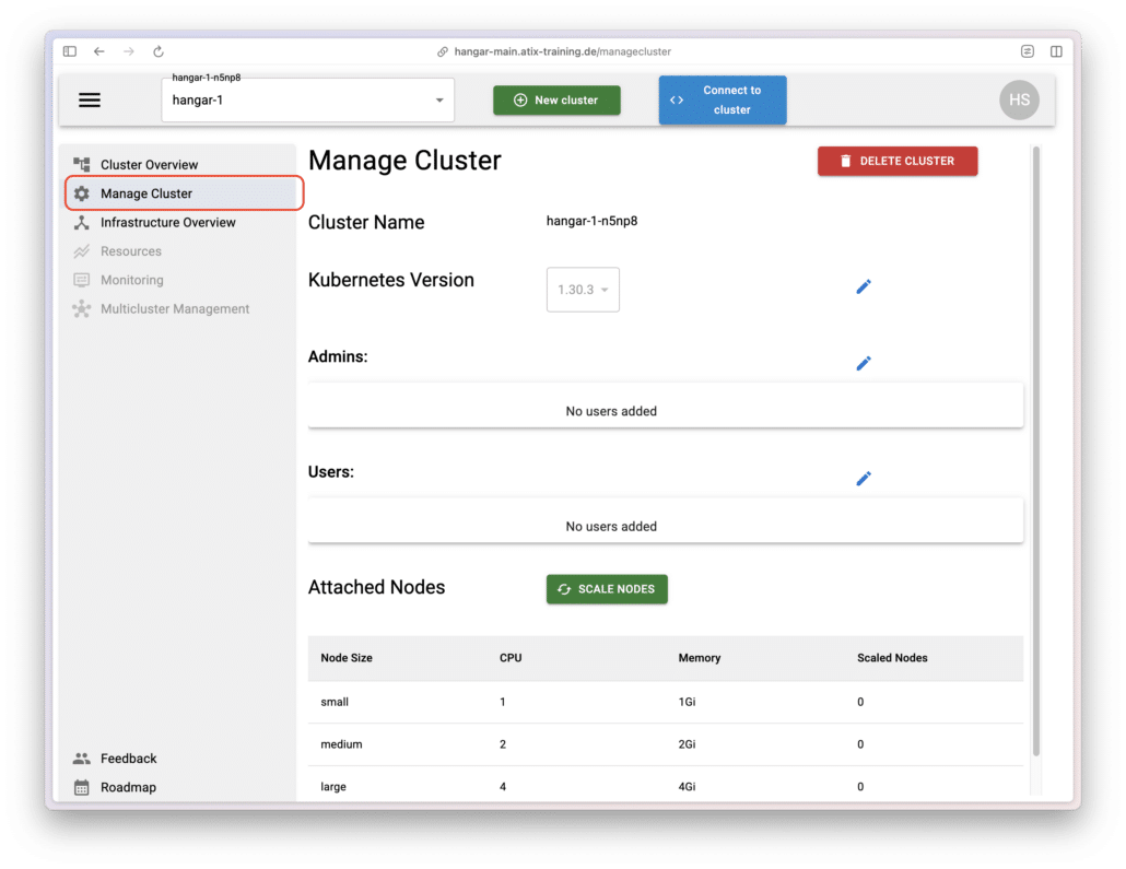 Hangar Cluster Admins werden über die Cluster Einstellungen konfiguriert und können ihren jeweiligen Cluster konfigurieren und Compute Ressourcen hinzufügen.