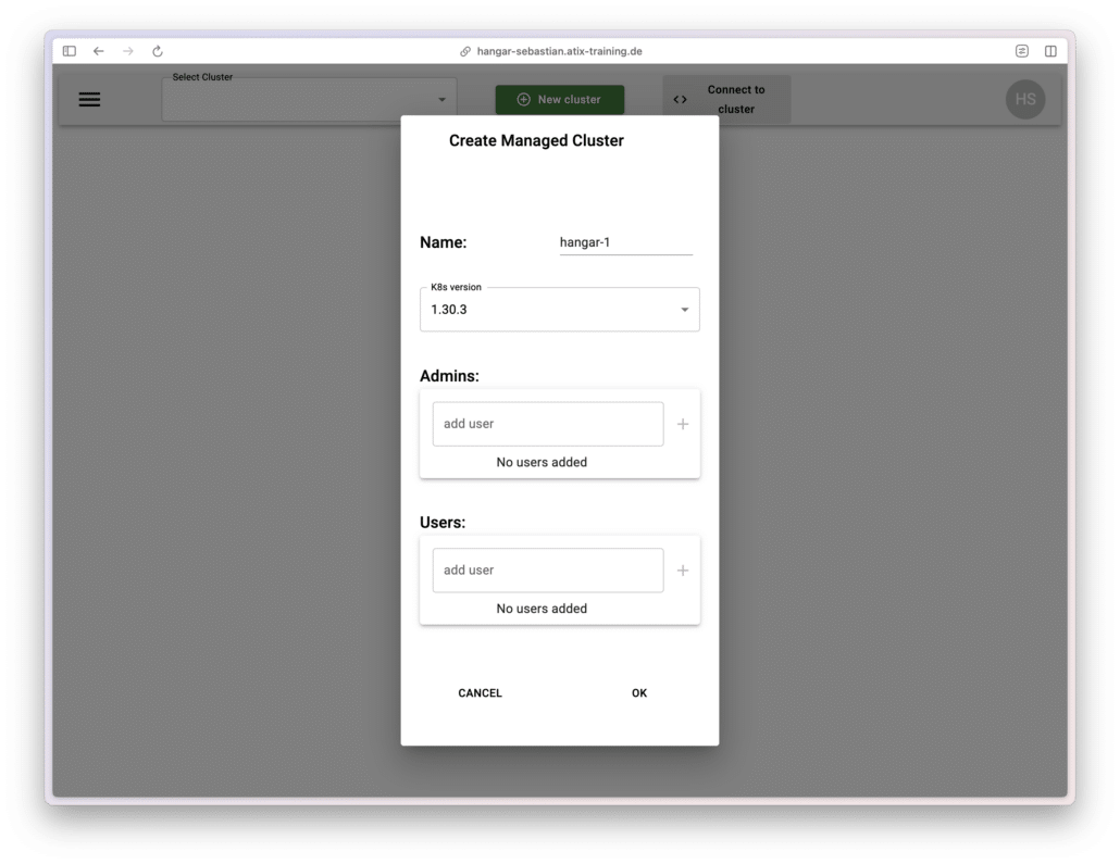 Hangar Cluster Users werden ebenfalls über die Cluster Einstellungen konfiguriert. User können ihre jeweiligen Cluster sehen und eine Kubeconfig