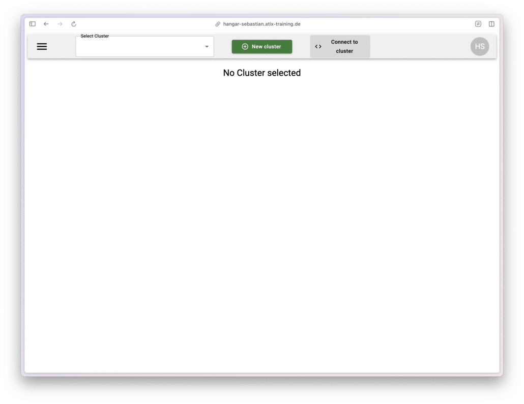User können in der Hangar-UI Cluster sehen. Admins können zusätzlich Cluster verwalten. Weitere Nutzer hinzufügen oder entfernen sowie Compute Nodes verwalten.