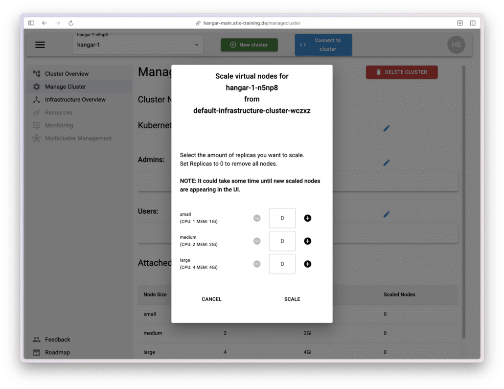 Hangar wird die gewählten Virtuellen Nodes dem Cluster joinen – vorausgesetzt im gewählten InfrastrukturCluster sind genug Compute Ressourcen vorhanden.